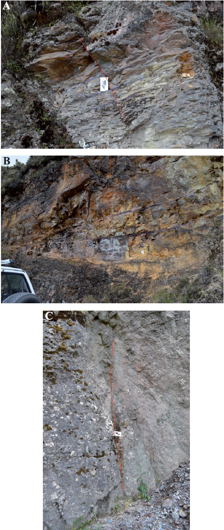Etapa 1. Recolección de datos: Medición directa o indirecta (mediante el uso de fotografías de alta resolución, en condiciones de difícil acceso) el espaciamiento entre las discontinuidades (fallas, fracturas o diaclasas) presentes en la roca a lo largo de líneas de referencia (transversal a las discontinuidades) con longitud de 1 m en afloramiento y hasta 20 m en fotografías. Las observaciones de interés en las diferentes discontinuidades fueron la orientación, el ancho, la naturaleza abierta o cerrada, el tipo de relleno y se reportó cualquier otro rasgo de interés. Las rocas (que corresponden a las lavas andesíticas del Chiles (Q1ach1, Q1ach3) y flujos de escombros del Chiles (Q1fech) (Velásquez y Parra, 2002), presentaban moderada meteorización, así como diaclasamiento y fracturamiento de carácter variable en dimensiones e intensidad. De igual manera, se observó variabilidad en el relleno de las discontinuidades: algunas fracturas presentaban alteración hidrotermal de color verde, mientras que otras estaban rellenas por material fino (limo o arcilla) con colores que variaban de amarillo a verde pálido, posiblemente de origen hidrotermal. Los materiales más finos cerca de las discontinuidades se identificaron como roca triturada y harina de falla. La FIGURA 2 muestra ejemplos de tres afloramientos característicos y el lector es referido a la TABLA 2 para detalles acerca de todas las estaciones de las dos campañas de campo.