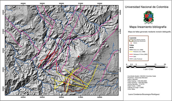 Comprendió la revisión detallada de documentos con información relacionada al área de interés. El principal propósito de la búsqueda de este material fue la identificación de las fallas en la zona que fueron documentadas en publicaciones. Adicionalmente, se realizó una búsqueda de literatura a nivel regional, incluyendo artículos con énfasis en la región sur occidental de Colombia. Se localizaron reportes y publicaciones de múltiples investigaciones y las principales fuentes disponibles incluyeron los trabajos de Velásquez y Parra (2002), Perdomo et al. (1986), Pinilla et al. (2007), Paris et al. (2000), Bayona et al. (2012), Jaillard et al. (2004), Acosta et al. (2007) y Rodríguez et al. (2008). Durante esta fase se realizó la digitalización de fallas y lineamientos reportados en los mapas de diferentes publicaciones usando software GIS (ArcGis) con el fin de construir un único mapa previo a la fase de campo. Este mapa fue denominado el mapa de referencias bibliográficas.