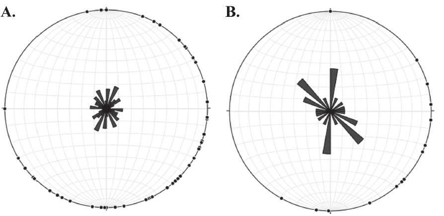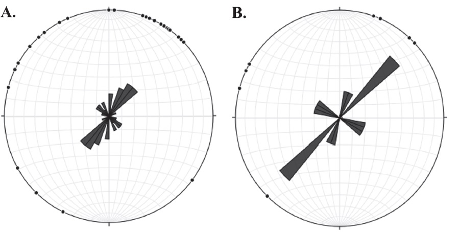Por último, se construyó un mapa local final de lineamientos, que enfatiza las estructuras propuestas para el área de interés del PGB, y tiene en cuenta datos de las observaciones de campo (FIGURA 7), por ejemplo, los tipos de afectación de las rocas. En la zona se documentan varias familias de diaclasas y fracturas, siendo las diaclasas más comunes aquellas producidas durante el enfriamiento de los diferentes flujos de lava, aunque también se observaron diaclasas perpendiculares a las diaclasas de enfriamiento, con direcciones preferenciales NW y EW. Las orientaciones de abundantes planos de diaclasas fueron medidas (dependiendo de condiciones de acceso) y en la FIGURA 8 se muestran las tendencias variables de estos planos, observados en los afloramientos relacionados en la TABLA 2.