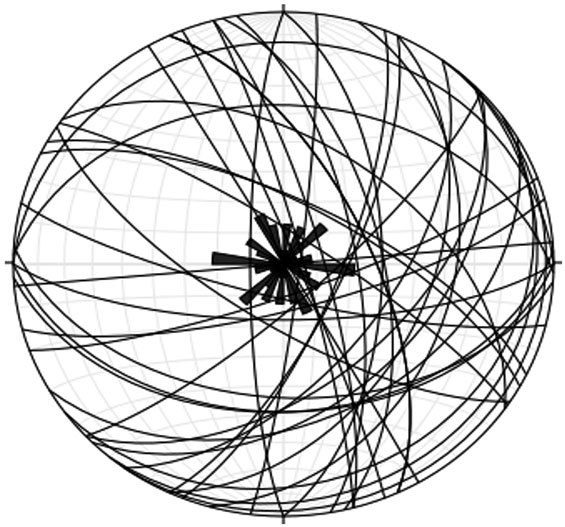 Los datos compilados consisten de un conjunto de lineamientos (identificados a partir de los mapas de referencias y de imágenes satelitales) y de datos de campo. El tratamiento de este conjunto de datos sigue los tres pasos propuestos por Mabee et al. (1994), con el fin de generar un mapa final con los lineamientos más representativos: (1) digitalización de todos los lineamientos identificables (ya fuese por consulta bibliográfica o por inspección visual de imágenes satelitales y DEM; (2) test de reproducibilidad con el cual se buscó superponer los lineamientos para descartar repeticiones y verificar su credibilidad, comparando los publicados con los propuestos en este trabajo; (3) análisis de dominio de superposición donde se integraron todos los datos estructurales de fracturas o lineamientos observados para la posterior construcción de un diagrama rosa, con el fin de determinar el dominio de fracturamiento.