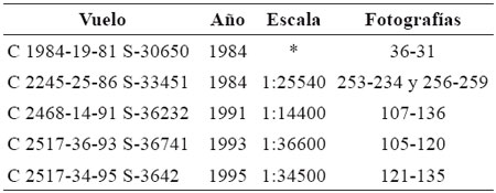 Las imágenes interpretadas durante esta fase fueron obtenidas de Earth Explorer (USGS, 2016). Se utilizó un modelo digital de elevación (DEM) y adicionalmente imágenes LANDSAT ETM+. Ambos tipos de datos fueron debidamente procesados mediante ArcGis. Específicamente, en el análisis del modelo digital DEM se optó por el uso de las herramientas de generación denominadas Hillshade para caracterizar mediante cambios en escalas de grises las variaciones en el relieve del área y realizar la identificación de lineamientos. El cambio sistemático en ángulo de iluminación permitió corroborar o descartar estructuras lineales. La herramienta TIN (Triangular Irregular Networks), permitió la detección de cambios topográficos para su posterior verificación en campo. Otras herramientas utilizadas fueron el mapa de pendientes (para determinar lineamientos) y el mapa de orientación de laderas. Para el estudio de los lineamientos en imágenes LANDSAT se usó la banda compuesta 742, una combinación en falso color con la cual se puede reconocer e interpretar el estilo estructural de la zona. Por último, se complementó con el uso de fotografías aéreas del período 1984-1995 en las cuales los cambios en escalas de grises pueden representar lineamientos principales. En la TABLA 1 se relacionan los datos relevantes de los grupos de fotos utilizados. Al mapa resultante del análisis de las imágenes mencionadas se le denominó mapa de imágenes satelitales