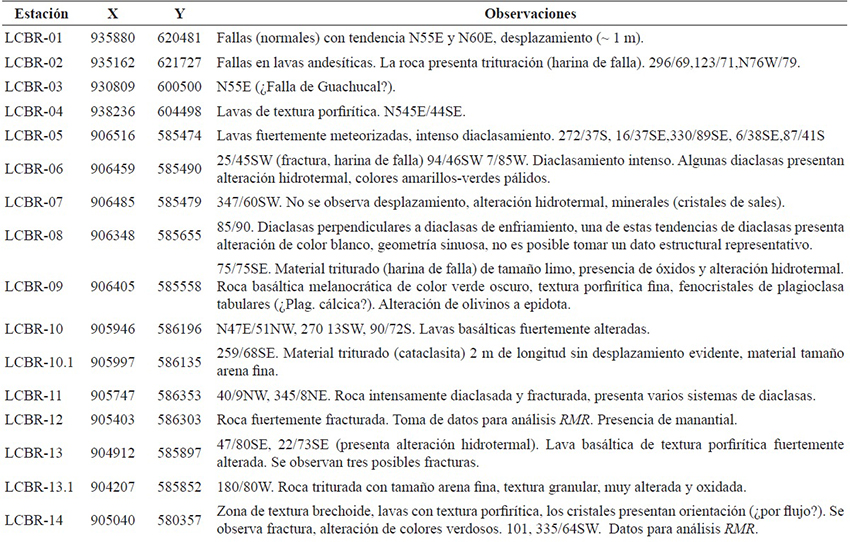 La información acerca de discontinuidades (fallas, diaclasas, fracturas) fue utilizada para la clasificación geomecánica de las rocas en el sistema RMR en cinco afloramientos del área de estudio. Los resultados y el procedimiento de cálculo se presentan en el ANEXO, el cual incluye fotos con estructuras típicas observadas y tablas con listas de parámetros relevantes calculados. Mediante los cálculos propuestos en Jerram y Petford (2011) se calcularon RMR superiores a 70 (ver ANEXO), siendo el valor más alto el quinto afloramiento con un RMR de 82. En este lugar había presencia de agua con una temperatura elevada, donde en un tiempo fue utilizado como balneario (aguas hediondas).