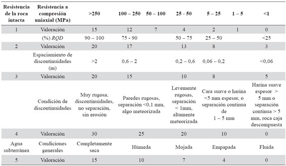 Etapa 2. Estimación de esfuerzo en roca usando el criterio Hoek-Brown: Se realizaron cálculos para calcular de modo aproximado el esfuerzo de compresión en la roca para posterior implementación en la clasificación RMR. En la clasificación de la roca, se tuvieron en cuenta los parámetros presentados en la TABLA 3.