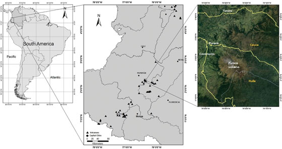 The PVS is located in the Central Andean Cordillera of Colombia, along the Coconucos volcanic chain, which belongs to the so-called North Andean Volcanic Zone (NVZ) in the Andean mountain range. The PVS belongs to Puracé and Coconucos municipalities, at 35 km from Popayán city to the west. The geographic coordinates are 2 ° 19’01 N and 76 ° 23 ‘53 W (FIGURE 1). The Puracé volcano is an active volcano build over the old Pre-Puracé volcano, which in turn, developed inside of huge caldera called Paletará. The volcano presents fumarole activity which is located close to interior of the crater; there is also an important fumarole field, NW to the outer flank of the PVS.