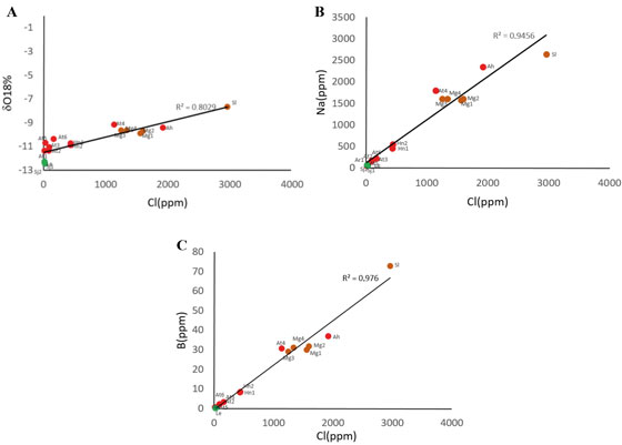 Another way of evaluating the mixture is through a linear relation of Cl with δ18O, Na and B. These linear relations evidence that ascending hot water has mixed with cold water. According to Arnórsson and Gunnlaugsson (1985) a positive relationship between that Cl and δ18O relation reveal evidence of mixing (Arnórsson and Gunnlaugsson, 1985) and other authors such as Burgos (1999) argues the linear relation between chloride and boron and chloride and sodium show evidence of mixing. In the FIGURE 10 illustrate a positive relationship between Cl with δ18O (FIGURE 10A), Cl – Na (FIGURE 10B) and Cl - B (FIGURE 10C) suggesting a dominance of the mixing process, making most reliable the data about the stable isotopes diagram.