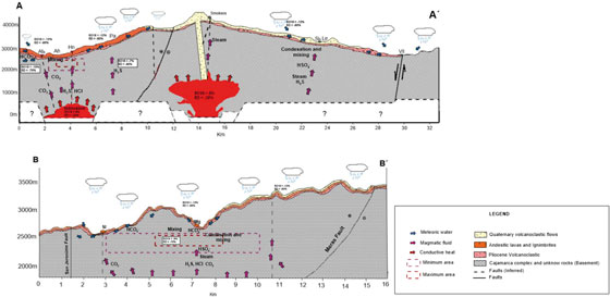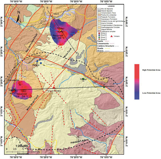 The preliminary conceptual model of the geothermal system in the survey zone is shown in FIGURE 11 and FIGURE 12. It suggests that the heat source in the geothermal system could probably be related to PVS where a transtensional fault allows the magma to ascend to close to surface. Therefore, it seems that the fluid flow of the geothermal system is controlled by permeable zones associated to faults, which play an important role in vertical permeability of geothermal systems. The seal rocks might be represented by impermeable volcanoclastic rocks from the Quaternary with Pliocene rocks. The reservoir should correspond to ignimbrites and other volcanoclastic rocks along with rocks from the Cajamarca complex suggesting a fracture zone influenced at the same time by the schistosity where the hot water fluids accumulate. The geological structures and the distribution of thermal manifestations on surface also indicate that the fluid flow is controlled by faults. The relative concentration of conservative ions and the B/Cl suggests different upflow for Group A and C but same plow for group A and D. The study of the isotopic composition of δ2H vs δ18O, as well as the linear relation of Cl with δ18O, Na and B in the hot springs, indicates that waters in the geothermal reservoir are originated from the mixing of meteoric waters with geothermal fluids. Considering that group A presents the best area for geothermal exploration due to the temperature of its geothermometers and geological characteristics, it can be assumed that the area of the minimum temperature reservoir is located around the hot springs of Aguas Tibias and the maximum is near the area Agua Hirviendo and Hornos.