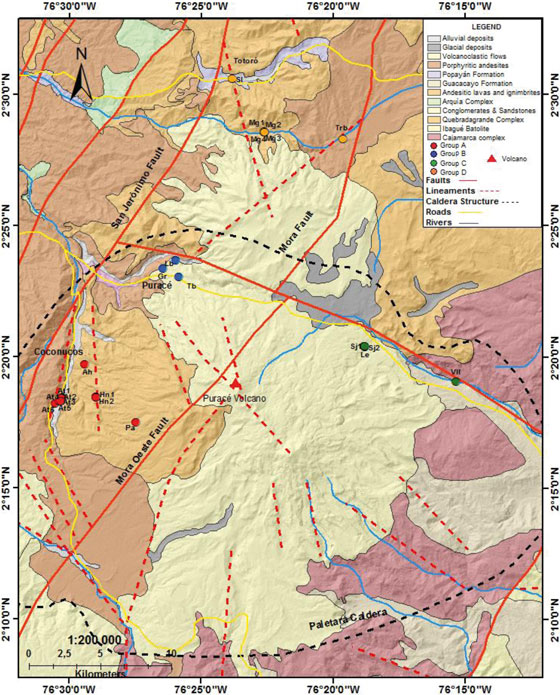 The PVS is associated to a metamorphic basement (Cajamarca Complex) in fault-contact with Cretacic volcanic rocks (Quebradagrande Complex), intruded by porphyritic Tertiary volcanic rocks (Maya and González, 1995). The main products of the volcanic activity are pyroclastic rocks, interspersed with lava flows of andesitic composition. The volcanic sequence at the west flank of the PVS consists essentially of the lava flow deposits, accompanied by the pyroclastic deposits. These deposits were associated to the Chagartón activity and caldera formation, possibly belonging to the Popayan Formation (Torres et al., 1999), and/or the Chagartón Member of the Coconucos Formation (Monsalve, 2000).