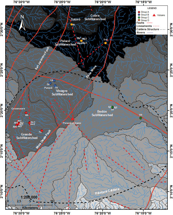The PVS area is influenced mainly by several watersheds such as the Vinagre river, Rio Grande, San Francisco, Anambio, Changue (Cauca river drainage system) and San Marcos and Bedon rivers (Magdalena river drainage system). Numerous hot springs are identified in the PVS area; they were divided into 4 groups (A, B, C, D), related to the above-mentioned watersheds systems (e.g. Grande, Vinagre, Bedon, Palace and Cobre). The group D contains the El Salado spring, that falls out of the watershed, however it was considered because it physical and chemical characteristic is very similar to the group D springs.