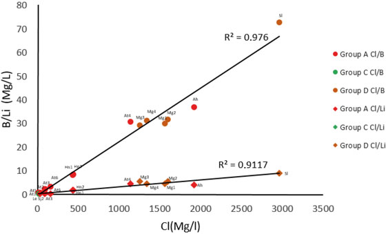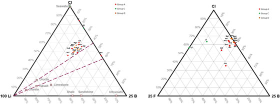 The conservative elements plots (B, Cl, F, Li) allow inferring the upflow of group A and grouping D probably are the same and the group C is different to them.