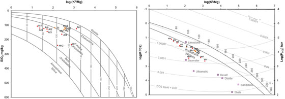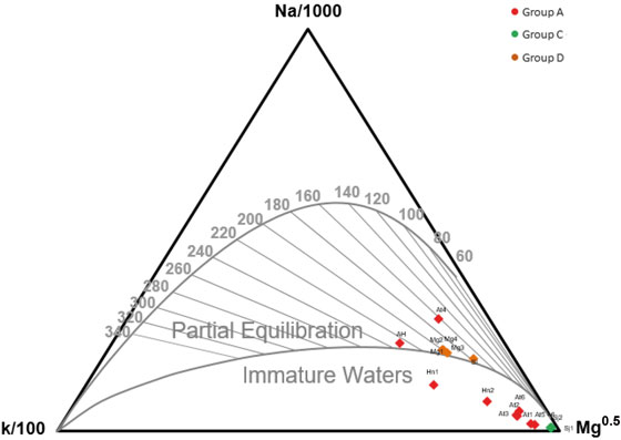 To analyze the mineral phases in equilibrium in low temperature, two geoindicators are used which are Xkms and Xkmc diagrams. The Xkms diagram (FIGURE 8A) shows a range with temperatures varying between ~80°C to ~130°C for groups A and D. They are plotted on the Quartz (conductive), Chalcedony or Alpha Cristobalite solubility line. Using this geoindicator helps comparing two low temperature geothermometers, increasing confidence in both if they match. On the other hand, the Xkmc diagram (FIGURE 8B) helps understand the processes based on equilibrium between K-feldspar, calcite and K-mica on one side and dissolved Ca+2 and K+ on the other to determine the partial pressure of CO2 at the final temperature of the water equilibration with rock, as determined by the K-Mg geothermometer where the values that are below the equilibrium line have the CO2 pressure (PCO2) higher than full equilibrium PCO2 and can promote Ca-Al silicates to calcite and possibly explain a possible formation of some clay minerals. These diagrams corroborate Na/K geothermometers corresponds to deep equilibrium conditions at the highest temperature, whereas K/Mg geothermometer represents shallower equilibrium conditions at the lowest temperature.