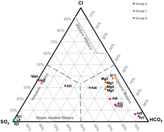 Considering the Tsch plot (FIGURE 6), the group A waters present a variation between bicarbonate waters to chloride-sulphate waters that can be caused by the different distance to the volcano crater since the farther areas present waters enriched with bicarbonate, while the waters near the volcano are enriched in sulfates and chlorides.