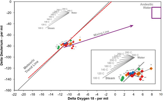 To understand if there is a mixture of different types of water, using the graph proposed by Giggenbach (1992) it is possible to see the stable isotopes to establish the origin of discharged fluids, sub-surface water mixing, water-rock interaction, and vapor separation processes (Nuti, 1991). In this case the isotope δ18O and 2H is used to know the origin of the waters. The applications of water isotopes are also useful in characterizing the boiling process and in monitoring flow of injected fluids (Arnórsson, 2000).