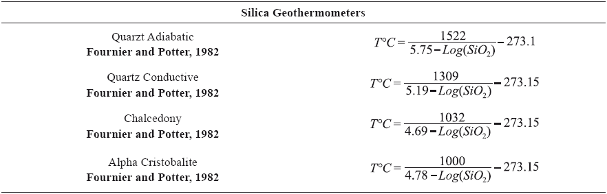 The interpretation of the chemical data and the calculation of Solute geothermometers and geoindicators were performed based on the spreadsheet proposed by Powell and Cumming (2010). The selected graphs and Solute geothermometers were: Tcsh, Tclb & Tcfb, Tnkm, Amorphous Silica, chalcedony, quartz via conductive cooling and quartz via adiabatic cooling (boiling).
