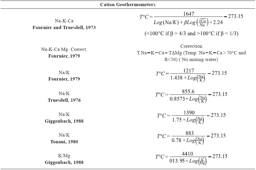 Finally, the K/Mg geothermometer is based on rules by Giggenbach (1988), this geothermometer is valid for temperatures between 50-300°C, and is most used in the study of low to intermediate equilibrium systems when equilibrium is not reached between the fluid and the complete mineralogical formation of the host rock (Nicholson, 1993). The Silica Geothermometers equations are illustrated in the APPENDIX 1 and the Cation Geothermometers equations in the APPENDIX 2.