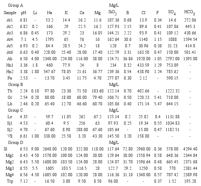 The HCO3 can be derived either by the dissolution of CO2 or by condensation of relatively deep oxygen-free groundwater geothermal steam, while the gains in SO4 is related to magmatic gases that rise through the permeable zones. The Group C waters are acid sulphates; the reason for the absence of the HCO3 may be possibly for the topographic levels, since the springs are above the water table or there is absence of CO2 in vapor, this absence may be originated during ascent of spring to the surface, fluids can experience CO2 losses by a phase separation and loss of vapor resulted of the mineral precipitations such as the calcite (Giggenbach, 1993). In this group, it can be deduced that the composition is dominated by steam condensation into near surface waters causing high concentrations of sulphate and calcium (Nicholson, 1993) and this explains the low amounts of remaining dissolved solids. Although Group D waters plots are located at the apex of bicarbonate water, they present high amounts of Cl- and Na+ with a pH close to neutrality showing a tendency towards maturity, coming from a zone of water partially balanced in the fluid - rock interaction. Moreover, they contain larger amounts in elements than the other groups. These higher concentrations could be related the interaction with hot waters, acidic magmatic gases and favorable conditions for the leaching of major rock forming cations and anions from host rock formations.