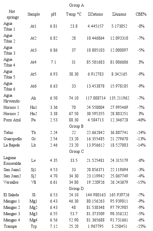 The chemistry of the waters at the PVS, indicated that Group B presents an imbalance (e.g. CBE exceeds +/- 10%), causing the entire group to be discarded for different analysis. This error in the ionic balance may be due to an error during the collection of sample or probably due to high acidity in the waters. Other springs of group A, C and D was also discarded for the same reason.