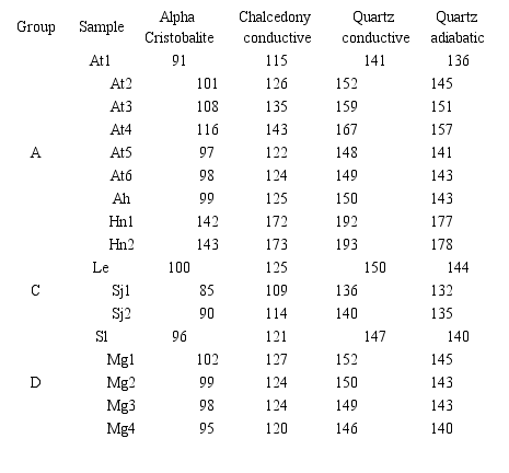 The calculated values for Solute geothermometers in the PVS are summarized in TABLES 4 and 5. Values on TABLE 4 were calculated with Silica geothermometer. These geothermometers work with the solubility of different silica species in water as a function of temperature and pressure (Karingithi, 2009). The Quartz geothermometers are suitable for temperatures >150°C, below this temperature, the Chalcedony and α-Cristobalite geothermometer that goes between 100°C - 150°C and below 100°C for Amorphous Silica is recommended. It was discarded the Amorphous Silica and β-Cristobalite because the temperature of Amorphous Silica is similar to the discharge temperature and β-Cristobalite is stable at very high temperatures and is probably not in the system. These values can be overestimated or underestimated depending on the conditions that the reservoir is found on, and later the appropriate ones for the study of the waters must be chosen. All the geothermal units are added for each group to know the temperature differences when they do not meet the requirements, although later those that are unsuitable will be discarded.