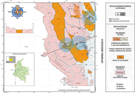 El Batolito de Acandí es un cuerpo irregular con diferencias composicionales que varían de granitos a gabros a lo largo de la cordillera Occidental colombiana (Rodríguez et al., 2010). De edad oligoceno (Restrepo y Toussaint, 1976), está siendo intruído por cuerpos subvolcánicos de andesitas, dacitas y diques de basalto; conjunto de rocas que a su vez, atraviesa un complejo de rocas vulcano sedimentarias llamado Santa Cecilia-La Equis. Todo este arreglo geológico, dada su situación espacial y relaciones de contacto, es posiblemente parte de una zona de subducción en la base de la cordillera Occidental (Duque-Caro, 1990), región en parte ampliamente conocida en la literatura como Bloque Choco-Panamá, parte norte del Caribe colombiano que aún presenta actividad sísmica.