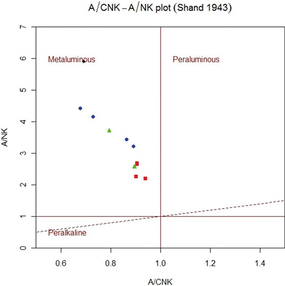 En estas series, se puede observar su bajo a medio contenido en potasio, lo que aumenta la abundancia de plagioclasa y clinopiroxenos y/o ortopiroxenos, hornblenda y óxidos de Fe y Ti, en comparación con la disminución de minerales como feldespato potásico y micas, en especial biotita, ya que esta ocurre en términos medios a finales. Tienen un carácter metaluminoso como lo muestra la FIGURA 10 (diagrama de saturación de alúmina de Shand, 1927). La anortita es prominente en la norma y contiene minerales oscuros como hornblenda, diópsido, y titanita, productos de alteración hidrotermal e incrustada allí.