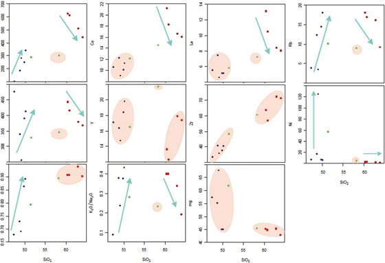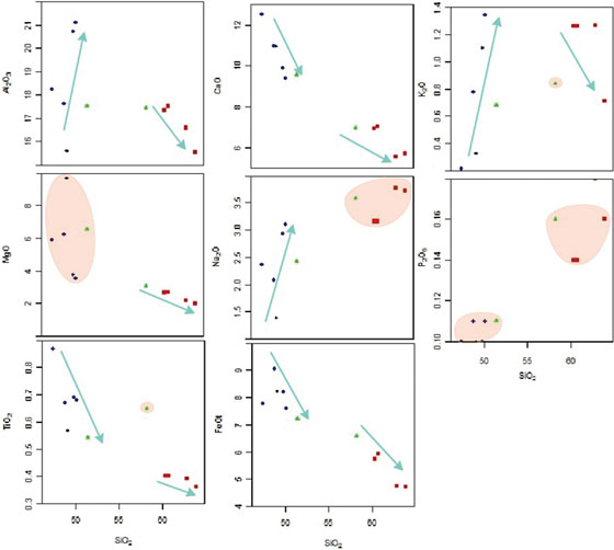 En un amplio rango de variación de estas rocas, de gabros a dacitas se nota que los diferentes óxidos muestran una suave variación en sus tendencias, lo que indicaría que podrían estar genéticamente relacionadas. El decrecimiento en CaO, MgO y FeO con el incremento de la SiO2, sería coherente con la cristalización temprana de plagioclasa y piroxenos desde el líquido inicial. El CaO es incorporado a la plagioclasa cálcica y al clinopiroxeno, en tanto el MgO y el FeO son incorporados en formación temprana por los minerales máficos, tanto en piroxenos como en anfíboles. El incremento de Na2O y K2O, se debe a que durante la diferenciación no son incorporados a los minerales principales que cristalizan, se conservan y/o concentran en el líquido residual.