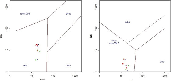 Con los datos obtenidos, se identifican las rocas del Batolito de Acandí según su clasificación geoquímica de elementos mayores propuesta por Whalen et al. (1987) como de tipo I; según Pearce et al. (1984) como granitoides de arco volcánico.