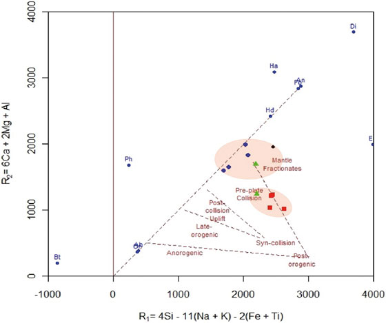 Con relación al ambiente geotectónico, se observa que las muestras representan rocas asociadas a zonas de subducción. En los diagramas de Pearce et al. (1984), las muestras se encuentran todas dentro del campo de los granitoides de arco volcánico (FIGURA 13). Son rocas con características geoquímicas de magmas fraccionados mantélicos en ambientes pre–colisionales, como lo muestra el diagrama de Batchelor y Bowden (1985) (FIGURA 14), en donde nuevamente, se observan los grupos geoquímicamente diferentes: la diferencia entre dacitas y andesita de gabros, basalto y un basalto andesitico. En el diagrama de Pearce et al. (1984) las muestras caen dentro del campo de rocas formadas en ambientes orogénicos (FIGURA 15).