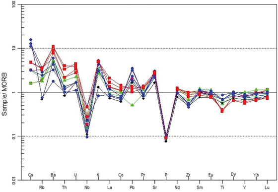 Los diagramas multi-elementares normalizados a MORB indican características de sistemas orogénicos pre colisionales. Sugieren el origen de estos cuerpos a partir de arcos volcánicos.