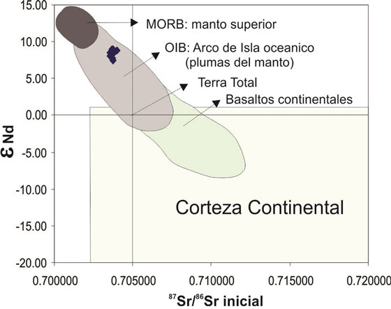 Al analizar las relaciones isotópicas de estas rocas, por la aplicación del método Sm-Nd, Rb-Sr, se puede observar, que la relación del εNd contra la relación 87Sr/86Sr, encaja el origen de estos magmas como OIB, en un origen relacionado a un arco de isla oceánico.