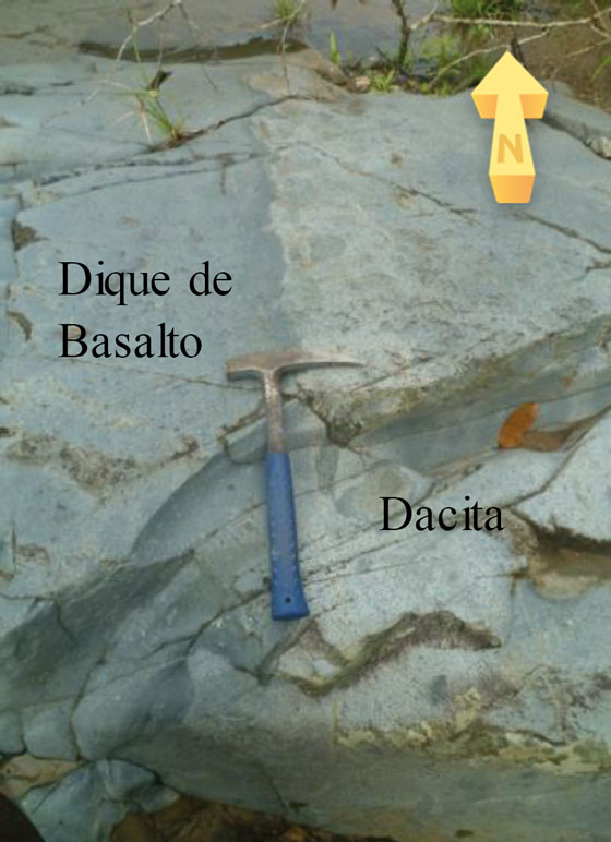El muestreo de roca realizado en este trabajo tiene un área de cobertura aleatoria desde el municipio de Unguía hasta la parte más norte, el municipio de Acandí, en el departamento de Chocó, puesto que el cuerpo tiene un acceso limitado dentro de una zona selvática. Sobre el río Unguía, afloran en su mayoría cuerpos irregulares de andesitas, dacitas y diques de basaltos. Los contactos en andesitas y dacitas son irregulares sinuosos, de lo cual se puede inferir que estos cuerpos aún estaban calientes cuando fueron intruídos por los diques de basaltos, y, por lo tanto, que no había pasado mucho tiempo desde su emplazamiento en ese nivel cortical y hasta la intrusión del dique. El contacto del gabro con las andesitas, dacitas y basaltos también se observa sinuoso. Estas rocas se encuentran formando numerosos diques y cuerpos que están atravesando el Batolito de forma irregular. Macroscópicamente, los basaltos que al igual que las andesitas, se muestran porfiríticos, melanocráticos y masivos, tienen un claro contraste con las dacitas que son masívas, con textura porfirítica, y leucocráticas de colores grises matizados de negro y blanco. El contacto entre los diques de basalto y las andesitas y dacitas, indica que no ha habido reacción o mezcla entre los materiales, normalmente debido a un contraste térmico fuerte o al estado muy viscoso o rígido de uno de ellos. En la FIGURA 3 se observa el contacto entre dos intrusiones subvolcánicas: una ocupa la parte izquierda (dique de basalto) y corta a la derecha (cuerpo de dacita). Estas intrusiones son repetidas a lo largo del río, basaltos que cortan cuerpos de dacitas y andesitas. Destaca la presencia de un borde de enfriamiento de color más oscuro entre las dos unidades, identificable por su aspecto afanítico (FIGURA 3). A su vez, estas rocas sub-volcánicas cortan a los gabros del Batolito de Acandí. Como roca intrusiva sólo se observan gabros encontrados, en la parte más occidental del río Unguía, en cercanías al municipio Tigre. Esta fase gabroide del Batolito, aflora en una extensión de aproximadamente 20 km2 en varios sectores de la zona de trabajo, y es inferida en gran parte por geomorfología, ya que presenta abundante vegetación. Los gabros son macroscópicamente inequigranulares, de fenocristales subhedrales de tamaño fino a medio, porfiríticos, con cristales de plagioclasa, hornblenda, con abundante pirita diseminada. No se observan en la zona rocas más ácidas, relatadas por Álvarez (1971), Botero (1975), González y Londoño (2002), Villagómez et al. (2011) y Rodríguez et al. (2010) en otras localidades para este cuerpo.