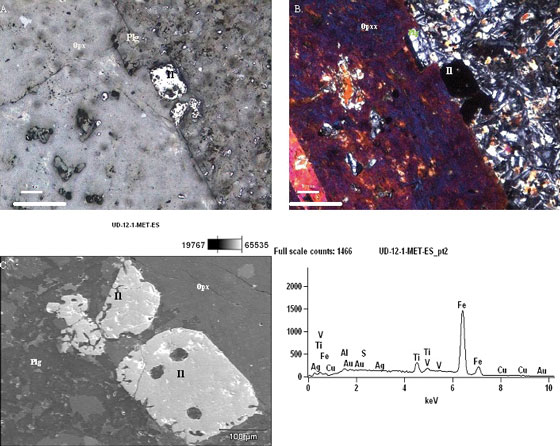 Minerales como apatito, pirita, magnetita, ilmenita (FIGURA 4) están presentes en todas las muestras como minerales accesorios. Diseminados por toda la roca, con formas anhedrales, incoloros, de alto relieve en la mayoría de los casos. Porcentualmente constituye desde el 0,2% hasta el 0,6%.
