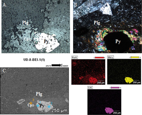 A. Luz reflejada mostrando la reflectancia de la pirita. B. Luz trasmitida con polarizador en donde se observa el carácter anisotrópico de la pirita, colores de interferencia en XPL, PPL y paragénesis mineral. C. Imágenes backscattering de la pirita con la medición cuantitativa de los elementos en EDS presentes hecha en SEM (mapa). Se resalta el alto contenido en molibdeno y azufre. (Py: pirita, Cpx: Clinopiroxeno, Plg: Plagioclasa y/o matriz con plagioclasa). D. Detección de elementos en la pirita.