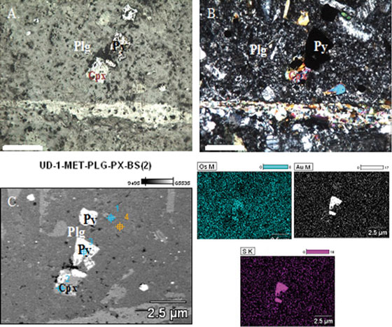 A. Luz reflejada mostrando la reflectancia de la pirita. B. Luz trasmitida con polarizador en donde se observa el carácter anisotrópico de la pirita y las texturas ofíticas presentes en toda la roca, colores de interferencia en XPL, PPL y paragénesis mineral. C. Imágenes en EDS de la pirita con la medición cuantitativa de los elementos presentes hecha en SEM. Se resalta el alto contenido en oro y azufre. (Py: pirita, Cpx: Clinopiroxeno, Plg: Plagioclasa y/o matriz con plagioclasa). D. Detección de elementos en la pirita.