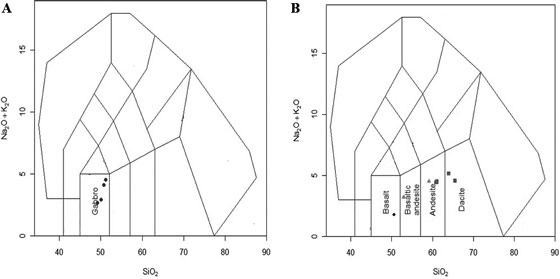 A. Diagrama TAS Middlemost 1994 (Na2O+K2O vs SiO2), adaptados, para rocas plutónicas aplicados a los litótipos del Batolito de Acandí. B. Diagrama TAS (Na2O+K2O vs SiO2) aplicados a los litótipos de los cuerpos de andecitas, dacitas y diques de basaltos. Azul=gabros, rojo=dacitas, verde=andesitas, negro=basalto.