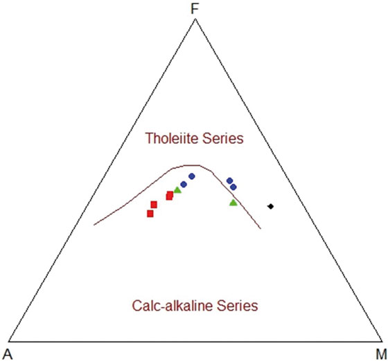 A partir de diagrama de evolución AFM de Irvine y Baragar (1971) (FIGURA 8) se observa que las rocas pertenecen a la serie calco alcalina en la mayoría de las muestras. Sin embargo, las dacitas, presentan una mayor tendencia calco alcalina, a diferencia de las rocas más básicas, que sugieren una tendencia toleítica en este diagrama o representan rocas precoces calco alcalinas de más bajo potasio. Esto puede deberse, a una evolución progresiva del magma. Estas son comparadas con los diagramas de Hastie et al. (2007) (FIGURA 9), en donde se observa, en general, esta misma tendencia.