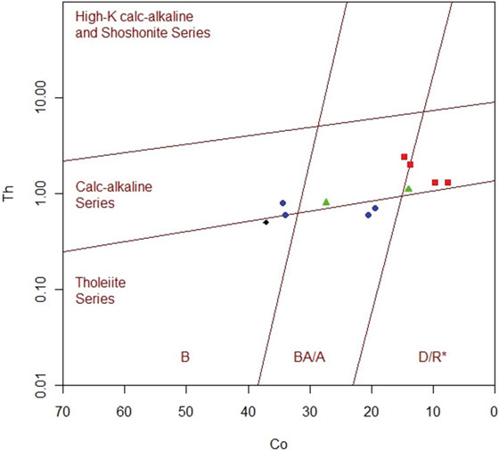 Todas las muestras son sub-alcalinas con tendencia calco-alcalina de bajo K (Cox et al., 1979), con indicación petrogenética relacionada a zonas de subducción.