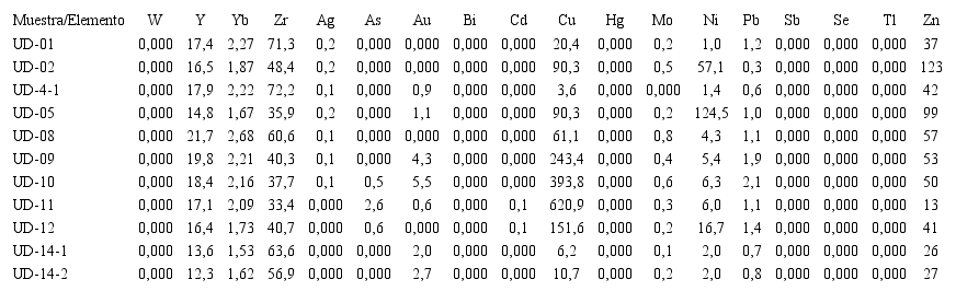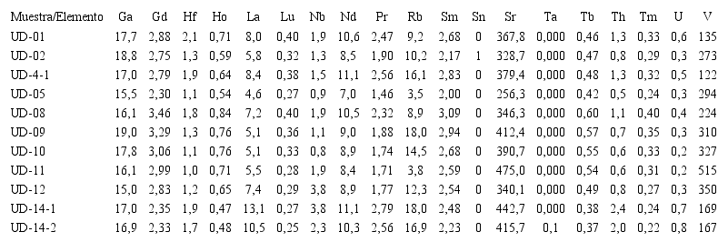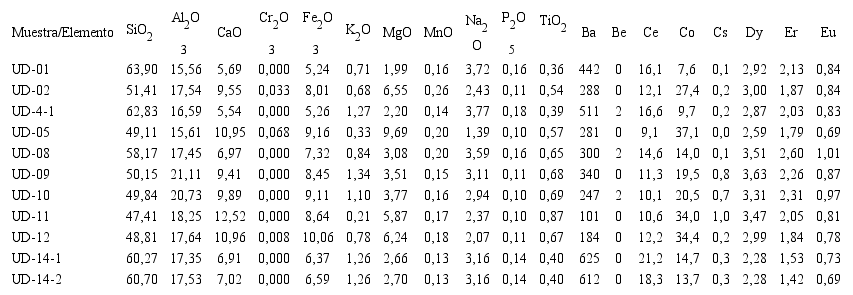 Las muestras fueron analizadas con XRF e ICP/ICP-MS, teniendo en cuenta que son homogéneas. Los valores obtenidos de los análisis geoquímicos son presentados en la TABLA 1.