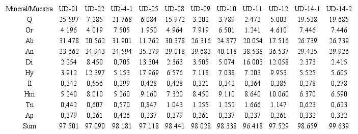 Para el análisis de estos resultados, se calcula la norma CIPW, basada en minerales normativos (aquellos esperados se formen desde un fundido anhidro a baja presión) para simplificar y organizar su composición química, enfatizando ciertas características particulares, como la “saturación en sílice”. Los resultados del cálculo de esta norma, se presentan en la TABLA 2.