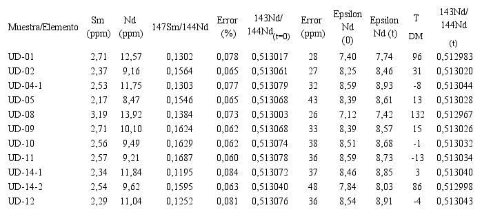 En la TABLA 3, se presentan los datos Isotópicos de Sm-Nd y Rb-Sr. De estos datos isotópicos son calculados los valores de las relaciones entre los isótopos de Nd y Sr, para lo cual se asume un tiempo estimado en 40 m.a. aproximadamente, edad propuesta en la bibliografía consultada para los cuerpos coetáneos al arreglo geológico estudiado (Álvarez 1971; Botero, 1975; González y Londoño, 2002; Villagómez et al., 2011; Rodríguez et al., 2010), para el cálculo de la razón inicial y de εNd.