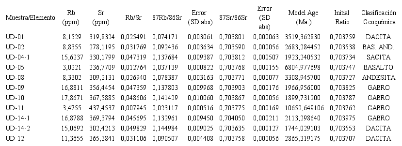 En general, las composiciones de Sm, Nd, Rb y Sr y las razones isotópicas de las rocas estudiadas (TABLA 3) son relativamente homogéneas. Los valores de Rb y Sr son mayores en rocas más básicas lo cual incrementa su razón Rb/Sr. Todos los radios medidos 87Sr/86Sr varían en el rango de 0,703590 a 0,704050, y los radios 143Nd/144Nd están dentro de 0,512967 y 0,513044. Todos los grupos de rocas estudiados presentan la misma marca petrogenética, a lo que se puede asociar un mismo ambiente de formación. La FIGURA 17, permite discriminar a nivel isotópico las dos tendencias de rocas diferenciados con anterioridad (dacitas y andesita de gabros, basalto y andesita). Las semejanzas en los radios isotópicos, podrían ser heredadas de la misma fuente.
