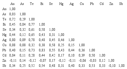 Se procesaron 962 muestras con análisis multielementales de 32 elementos, realizados en diferentes exposiciones de veta al interior de la mina Los Mangos. La mineralización está caracterizada por las asociaciones Au-Te, Au-Ag-Te y Au-Te-Pb (TABLA 1). Las concentraciones de As, Se y Sb son bajas (promedio de 1,23 ppm, 0,53 ppm y 0,09 ppm respectivamente) descartando la presencia de arsenopirita, seleniuros y estibina en la mineralización. Las elevadas concentraciones de Te (>135 ppm), Pb (>115 ppm) y Cu (>181 ppm) corresponden a la presencia en la mineralización de telururos de Au (calaverita), telururos de Au-Ag (hessita y silvanita), telururos de Pb (altaita), galena y calcopirita respectivamente; introducidos durante la segunda y principal etapa mineralizante. Se observaron contenidos moderados de Hg (8,98 ppm) reflejando la presencia de coloradoita en la mineralización. Las concentraciones de W están cercanas al límite de detección (<0,2 ppm). Las muestras analizadas presentan contenidos de Au y Ag variados, sin embargo la relación Au/Ag calculada con ensayes al fuego de más de 7.000 muestras de canal al interior de la mina Los Mangos varía entre 1:2 y 1:3. La buena correlación entre Au y Te es resultado de la presencia de telururos de Au y Au-Ag en la mineralización (FIGURA 7).