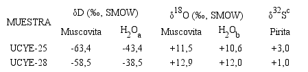 Se realizaron análisis de isótopos estables de δD, δ18O contenidos en filosilicatos de la veta y azufre δ34S en pirita contenida en la veta TABLA 2. Todas las muestras fueron recolectadas al interior de la mina Los Mangos. La composición isotópica del hidrógeno δD y el oxígeno δ18O, fue determinada en dos muestras usando procedimientos convencionales, de preparación y análisis; se seleccionaron y separaron moscovitas hidrotermales (moscovita). Los rangos de valores isotópicos obtenidos en este estudio en moscovita para δ18O están entre +11,5 y +12,9%o y para δD varían entre -63,4 y -58,5%o respectivamente (FIGURA 8A). La mayoría de los granitos, rocas metamórficas y sedimentarias están enriquecidos en δ18O con relación al valor del manto, mientras que las aguas de mar y las aguas meteóricas tienen déficit de δ18O (Rollinson, 1993). Los valores anteriormente mencionados para oxígeno e hidrógeno proyectados en un diagrama de gráfico δ18O vs δD grafican en el campo de aguas metamórficas según Taylor (1974) y Sheppard (1981), descartando de plano una mezcla con aguas meteóricas. La composición isotópica del azufre δ34S (en pirita), fue determinada en dos muestras, pertenecientes a la segunda etapa de mineralización. Los valores varían entre +1,0 y +3,0%o. Estos valores igualmente se podrían asociar a rocas graníticas y/o rocas metamórficas (FIGURA 8B).