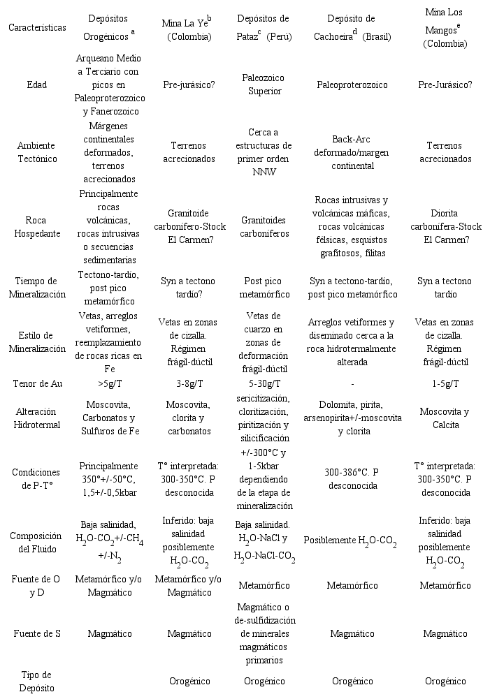 La mina Los Mangos es un depósito de Au-Ag hospedado en una zona de cizalla, con mineralización en vetas de cuarzo. Las características geológicas, descritas en este documento, incluyendo geología estructural, roca encajonante, alteración hidrotermal, estilo de mineralización y composición isotópica de δ18O, δD y δ34S, indican que la mina Los Mangos es compatible con el modelo de depósitos de tipo Oro Orogénico (Orogenic Gold Deposits), definido por Groves et al. (1998), del subtipo depósitos de Filones Auríferos Hospedados en Granitoides (Granitoid-Hosted Lode-gold Deposits) en el sentido de Haeberlin (2002), Qiu et al. (2002), Haeberlin et al. (2004) y Kreuzer (2006). En la TABLA 3 se presenta una comparación de las características geológicas de la mina Los Mangos contra las características definidas por Groves et al. (1998) para los depósitos orogénicos, Naranjo-Sierra et al. (2016) para el depósito La Ye, Haeberlin (2002) para el depósito de Pataz en Perú y Klein et al. (2005) para el depósito de Cachoeira en Brasil. Debido a que la veta en la mina Los Mangos se encuentra encajada en una roca ígnea plutónica se podría pensar en una posible relación genética entre la estructura vetiforme y el plutón encajonante como en los depósitos de tipo Relacionados a Intrusivos (Instrusion-Related) en el sentido de Sillitoe y Thompson (1998). Sin embargo, se debe ser cauteloso en deducir cualquier relación genética entre los depósitos vetiformes de Au asociados u hospedados en intrusivos (Haeberlin, 2002; Hart, 2005). Las diferencias en el estilo de mineralización, características geoquímicas, ambiente tectónico y posible edad de la mineralización permitieron descartar por el momento este tipo de modelo genético para la mina Los Mangos.