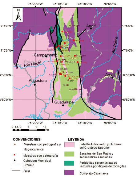 Doce muestras de roca fueron analizadas químicamente, 9 de estas en el laboratorio del Servicio Geológico Colombiano (SGC) y 3 en el laboratorio de la Universidad de Cardiff – Inglaterra. Las muestras fueron seleccionadas considerando el menor grado de alteración y deformación, ya que la unidad se encuentra en el contacto entre las rocas metamórficas y las del Batolito Antioqueño, presentando comúnmente alteraciones deutéricas. Los contenidos de óxidos de elementos mayores y de los elementos trazas V, Mo, Nb, Ta, W, Zr y Hf fueron determinados con el método de fluorescencia de rayos X para las muestras analizadas en el SGC. Para el resto de elementos traza y tierras raras se utilizó el equipo de espectrometría de masas con plasma acoplado inductivamente (ICP-MS). Para las tres muestras analizadas en la Universidad de Cardiff (INM-5271, INM-5324, INM-6180) se utilizó el método ICP-MS, tanto para los óxidos de elementos mayores como para los elementos trazas. En la interpretación de los resultados geoquímicos las concentraciones de los óxidos de los elementos mayores fueron recalculados en base seca, teniendo en cuenta los valores de LOI (perdidas por ignición).