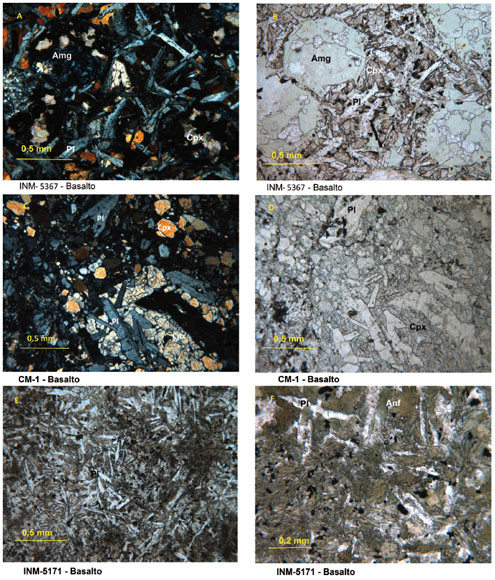 La unidad Basaltos de San Pablo está constituida predominantemente por basaltos y ocasionales gabros; localmente se presentan brechas volcánicas. Las rocas han sido afectadas hacia los contactos con las rocas metamórficas por deformación frágil y dúctil, presentando localmente metamorfismo dinámico y estructura foliada (milonitas y protomilonitas) y rocas con deformación frágil, con trituración parcial y completa de los minerales (cataclasitas). Por otra parte, la unidad fue afectada en sus bordes por alteración deutérica de piroxenos a anfíboles con hábito fibroso, introducción de venillas de epidota y alteración de plagioclasa y piroxeno a epidota, sericita y calcita (alteración propilítica). Predominan los basaltos con texturas ofítica, subofítica, intergranular, intersectal, variolítica y ofítica-porfídica con escasos fenocristales de plagioclasa; en algunos casos se presentan amígdulas rellenas de clorita, calcita y cuarzo (FIGURA 3).