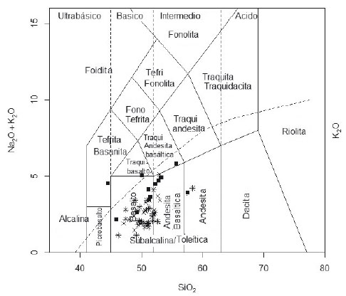 Las rocas analizadas de la unidad Basaltos de San Pablo se distribuyen en el diagrama TAS (Le Bas et al., 1986) en los campos de basaltos y andesitas basálticas; la muestra INM-5185 alcanza el campo de las andesitas y la muestra FS-01 el campo de las basanitas de afinidad alcalina, esta última con contenido de SiO2 de 43,13%. Se puede observar que la mayoría de las muestras pertenecen a la serie subalcalina (FIGURA 4). En el mismo diagrama se graficaron muestras de rocas basálticas de las unidades Diabasas de San José de Urama (asteriscos) y del Complejo Quebradagrande (equis) (FIGURA 4). Se hace evidente que las muestras de la unidad Basaltos de San Pablo poseen contenidos más elevados de álcalis y de K2O.
