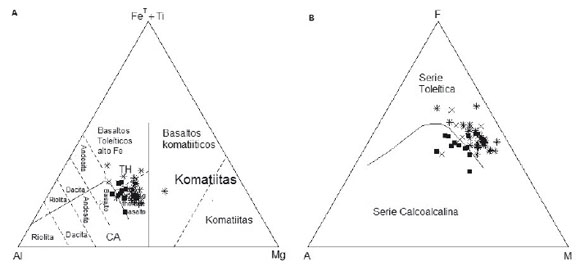 En el diagrama triangular Fet+Ti, Al, Mg de Jensen (1976) (FIGURA 5A)-, se observa que la mayoría de rocas de la unidad Basaltos de San Pablo, el Complejo Quebradagrande y las Diabasas de San José de Urama se concentran en el campo de la serie de basaltos toleíticos ricos en Mg, con algunas pocas muestras dentro del campo de los basaltos toleíticos ricos en Fe.