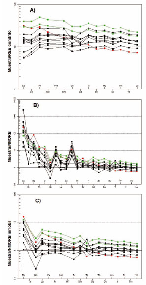 En el diagrama de REE normalizados con respecto al condrito (valores de normalización de Nakamura, 1974), las muestras de la unidad Basaltos de San Pablo presentan tres diferentes patrones (FIGURA 6): 1- las muestras INM-5324, INM-5771, INM-6180, INM-5271, IGM-6816, IGM-6772, CM-2, CM-1, FS-01, FS-02 tienen un comportamiento paralelo (muestras en color negro), con un patrón con empobrecimiento en tierras raras livianas (La, Ce) (LREE) similar al patrón de basaltos tipo N-MORB (FIGURA 6A), el cual presenta enriquecimiento ligeramente mayor a 10 veces el condrito, y una tendencia plana horizontal hacia las HREE, con anomalía negativa de Eu para las rocas con mayor contenido de SiO2, anomalía que puede ser asociada a la remoción de plagioclasa. Las muestras INM-5312 y INM-5365 (en color verde) corresponden a las rocas geoquímicamente más diferenciadas, presentan una pendiente suave negativa desde las tierras raras livianas (LREE) hacia las tierras raras pesadas (HREE), conservan el paralelismo en las HREE con relación a las muestras menos diferenciadas o primitivas y tienen un comportamiento similar al de las rocas de arcos de islas bajos en K. La muestra INM-5185 presenta pendiente negativa más pronunciada que atraviesa el patrón de las demás muestras, con empobrecimiento desde las LREE hacia las HREE similar a la tendencia que presentan las rocas generadas en ambiente de arco.