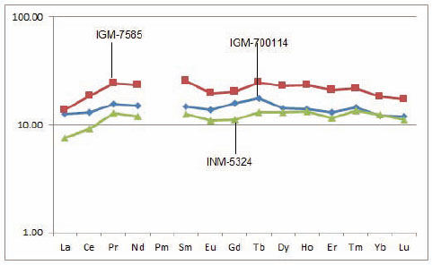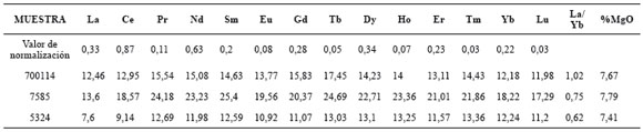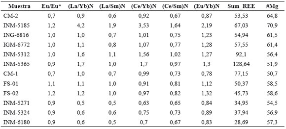 La muestra INM-5185 presenta relaciones de (La/Yb)N y (La/Sm)N más altas que las demás muestras, del orden de 4,2 y 1,96 respectivamente y un mayor #Mg (de 70,9), mientras en el resto de muestras el #Mg varía entre 50 y 64 (TABLA 4).