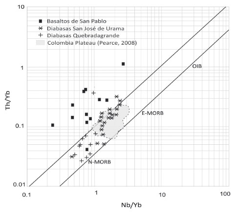 Las rocas de la unidad Basaltos de San Pablo grafican por encima del campo (MORB-OIB), resultado que corrobora que estos basaltos se formaron en arcos de isla o cuencas de back-arc. Una sola muestra de basalto de esta unidad (CM-1) gráfica dentro del campo de las rocas de corteza oceánica, hacia los basaltos oceánicos de tipo N-MORB y se ubica junto a las muestras de diabasas del Complejo Quebradagrande. Las muestras de la unidad Diabasas de San José de Urama grafican entre los basaltos N-MORB y E-MORB, en el campo de los basaltos de corteza oceánica y dentro del campo del plateau Colombia delimitado por Pearce (2008), siendo las rocas de esta unidad generadas en este plateau. Las muestras de la unidad Basaltos de San Pablo presentan relaciones Nb/Yb similares y relaciones Th/Yb mayores a los basaltos (diabasas) del Complejo Quebradagrande y corresponden a basaltos de arco formados en un ambiente de subducción oceánica, donde a las rocas de arco se le adiciona Th móvil proveniente de la subducción y se desplazan los valores por encima del campo MORB-OIB (Pearce et al., 2005).