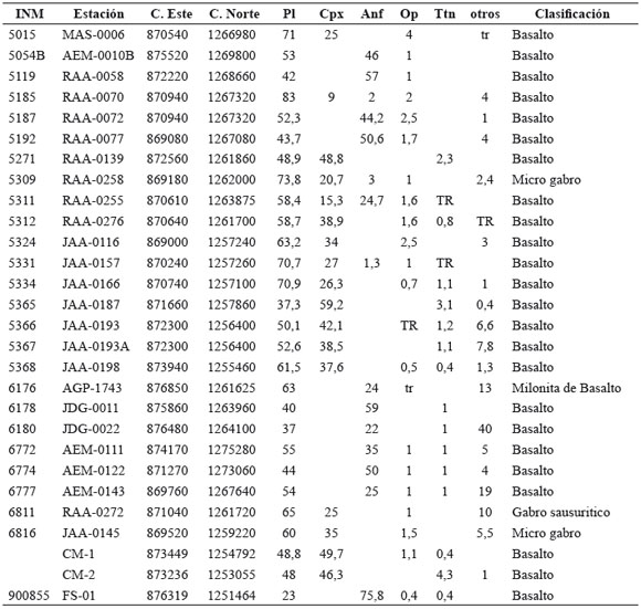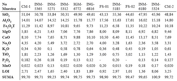 En la TABLA 2 se presentan los resultados de las concentraciones de los óxidos de elementos mayores de las rocas basálticas de la unidad Basaltos de San Pablo, las cuales presentan valores de SiO2 entre 43,13% y 55,36%, concentraciones de MgO en el rango entre 5,85 y 9,45%, Fe2O3 que varía entre 8,22 y 11,42%, contenidos de Al2O3 entre 14 y 17,6%, valores CaO entre 7,16% y 12,53%, la concentración de TiO2 en la mayoría de las muestras varía entre 1 y 2% (más altos que en las rocas de las Diabasas de San José de Urama que presenta valores <1% y similares a los basaltos (diabasas) del Complejo Quebradagrande). Las muestras (FS-01 y FS-02) presentan valores mayores a 3% en TiO2 y la muestra INM-5185 un valor menor a 1% (0,75%); baja relación del álcalis vs SiO2 (0,03 a 0,10 wt%) y valores de K2O bajos de 0,30% a 1,25%. Las pérdidas por ignición en la mayoría de las muestras son del orden de 0,92% a 3,25%, debido a la alteración moderada y deformación de las rocas a excepción de la muestra INM-5324, la cual presenta perdidas por ignición del orden de 8,06% debido a presencia de venillas de calcita que sugieren perdidas por calcinación de CO2 (TABLA 2).